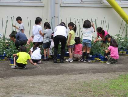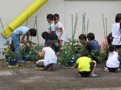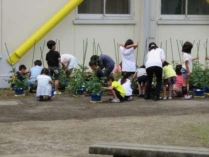 など、お世話をいながら、子どもたちは、自分のミニトマトの成長の変化を楽しそうに観察していました。