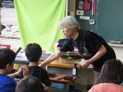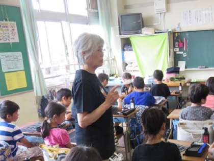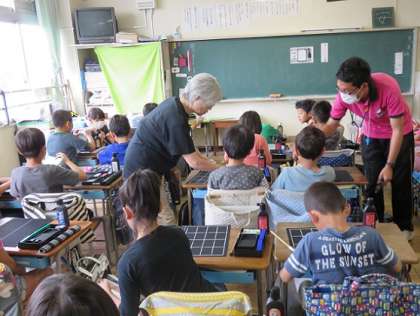 子どもたちがセットした習字道具の置き方を、宮崎先生や担任の先生、そして、3年生の習字を教えてくれる先生とたくさんの先生方が、机の間を回って、一人ひとり教えてくれていました。