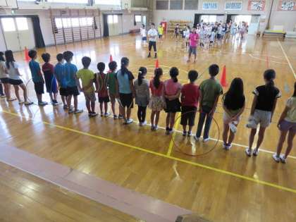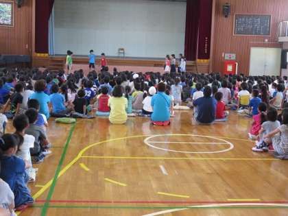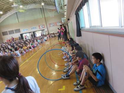 児童集会での発表を成功させるために、運動委員会の子どもたちは、とても真剣に取り組んでいました。ほかのチームが実演をしているときも、舞台横で、しっかりとその様子を見つめていました。また、児童集会が始まる前に、早くに体育館に集まり、リハーサルをしていました。