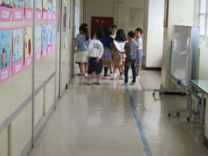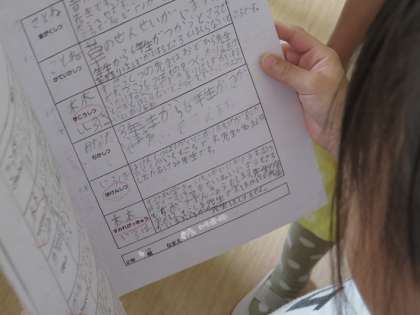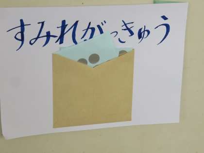 生活科の『学校たんけん』をしている1・2年生は、すみれ学級の所が案内場所の一つになっています。案内係の担当の2年生が、1年生に案内のメモをもとに紹介をします。そして、教室の所に張ってあるシールを、ワークシートに貼ります。生活科の学習の中にも、校内にある特別支援学級の紹介を盛り込むなど、自然な形で理解教育を進めています。