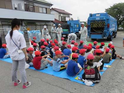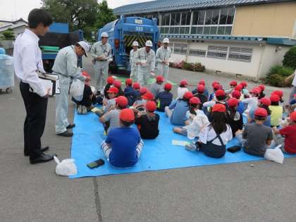 駐車場で、ゴミ収集車の前で、清掃事務所の方に手袋を配っていただき、いろいろな体験活動の準備をしていただきました。配っていただいた手袋は、清掃事務所の方がご用意していただいたものです。ご準備をしていただけて、本当にありがたく思っています。