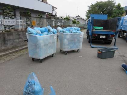 子どもたちの人数分の可燃ごみの袋をコンテナに用意さていました。しかし、生ごみなど実際の物を投げ込むのは、腕力や投力がそれなりに必要となるので、紙を主体に軽めの模造の“体験用ゴミ袋”になっていました。