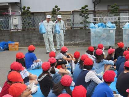 子どもたちは、投げ込みはしませんが、実際に家庭から出される重さのゴミ袋も二つ用意されていて、それを一度持ち上げる体験もありました。