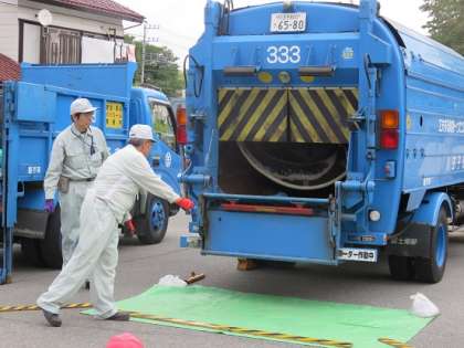 ゴミ収集車の挿入口への、子どもたちの投げ込み体験に先立って、清掃事務所の方が、実演をしてくれました。