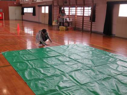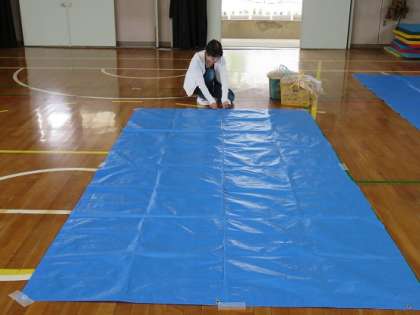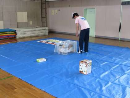 今日の放課後子ども教室では、浅川児童館の出張児童館がありました。児童館の先生方やお世話いただく保護者の方は、まず、積み木やプラ版などのためのブルーシート張りなどの準備をしてくれます。