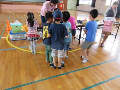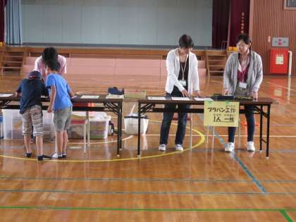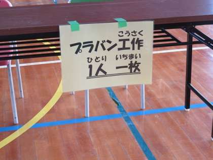 出張児童館の受付の準備も進められていました。受付の準備ができると、子どもたちは並べられた学年別の名簿に、自分の名前を書いて、それが済むと、プラ版の材料を一枚もらいます。