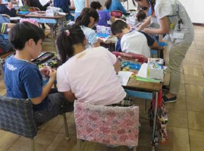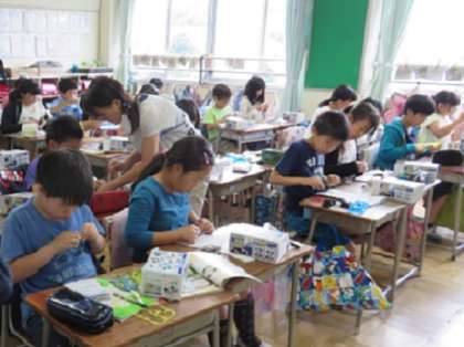 子どもたちは、説明書を見ながら、一所懸命組み立てていますが、すぐには思い描くようにはいかないようです。先生が机の間を回りながら一緒に組み立てたり、友だち同士で教え合ったりしていました。