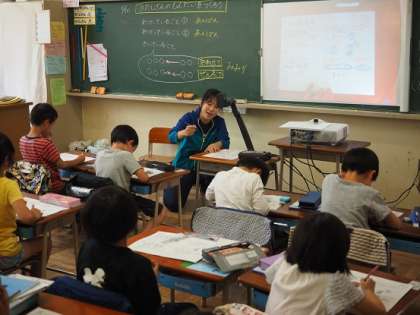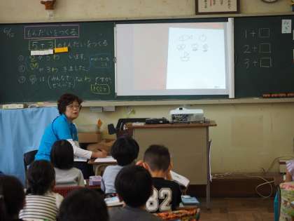1年生の教室では、『もんだいをつくる』をめあてに学習が進められていました。たし算の意味や仕組みがしっかりと理解できているかを、この問題づくりを通して確かめています。2年生の教室では、“ものさし”の正しい使い方を身に付けられるように工夫されて指導されていました。