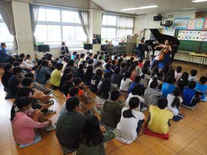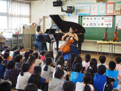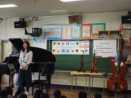 6年生の子どもたちは、チェロのミニコンサート(アウトリーチコンサート)で、すてきな音楽鑑賞をしました。授業参観に来られた保護者・地域の方々も一緒に、チェロの音色を聴いていただきました。チェロリストは伊藤七生さん、ピアニストは阿部知佳さんでした。そして、子どもたちの聞いた曲目は、エルガーの「愛の挨拶」、バッハの「無伴奏チェロ組曲第3番前奏曲」、サンーサーンスの「白鳥」、外山雄三の「沖縄の木やり」でした。