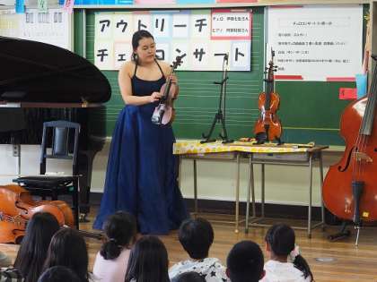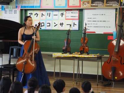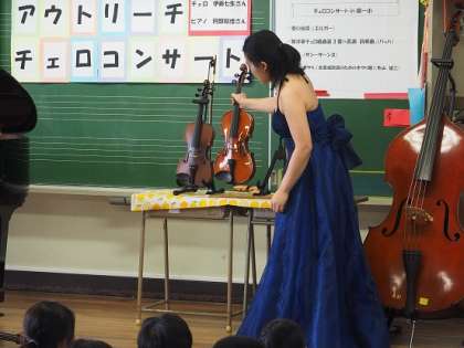 すてきな音色のほかに、コンサートの場面では、演奏に使われるチェロやバイオリン、ビオラなどの楽器の紹介をしていただきました。