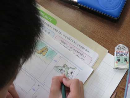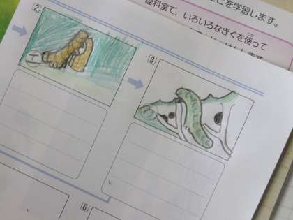 3年生の子どもたちは、今、総合的な学習の時間で、カイコを育てています。そして、理科の学習では、こん虫について勉強しています。ワークノートに、こん虫の絵を描きながら、こん虫の身体の特徴について理解を深めていました。こん虫を詳しく見て、気持ちを込めて、ていねいに描いている子を見つけました。
