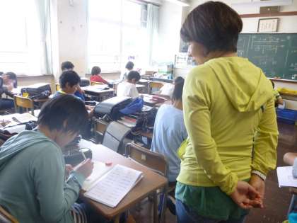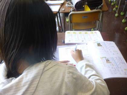 今日も4年生〜6年生対象に放課後学習教室がありました。帰りの会が終わると、高学年の子供たちが算数教室に集まってきました。すぐにランドセルから自分たちの学習道具を取り出し、黙々と学習に取り組んでいました。