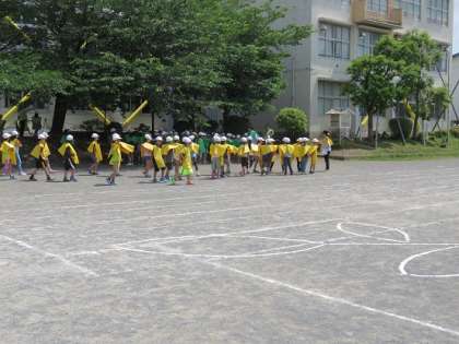 今日はちょうど晴天で、まぶしくて、上の方を見上げることが難しいくらいです。暑い中、1年生が、