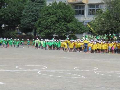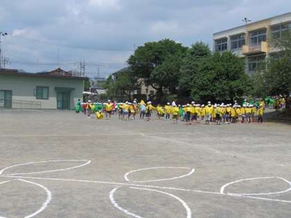 黄色や緑のエプロンを被った子どもたちが、次に何をするのかイメージも浮かばないまま、昇降口から次々に校庭に出てきて並びました。