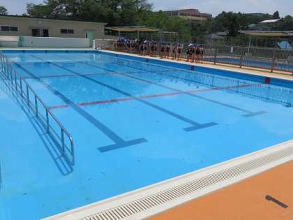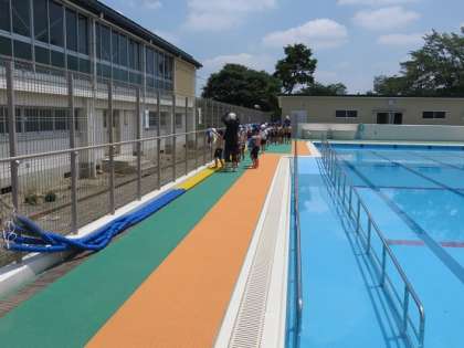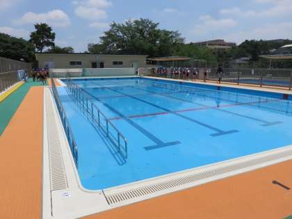 本校のプールは、全面改修を行ってから、2〜3年目の市内でも2番目に新しいプールです。温水シャワーやスロープなどが設置されています。