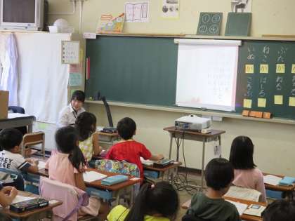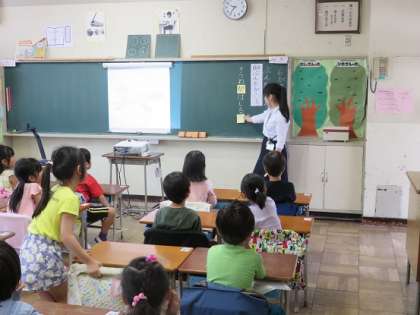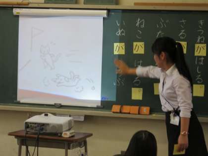 子どもたちが視覚的に捉えやすいように、“が”や“○”の文字カードを用いたり、書画カメラを使ったりしていました。