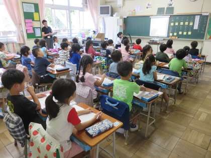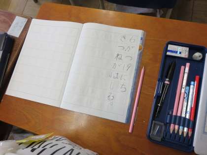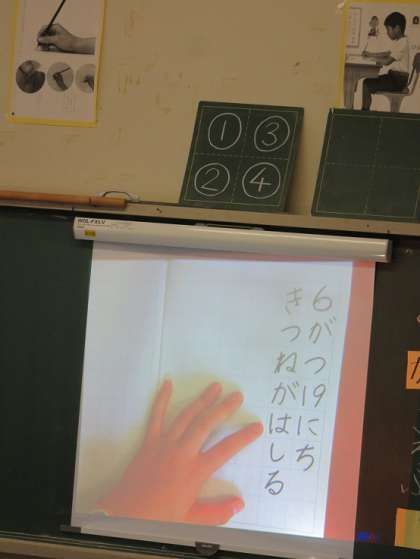 子どもたちは、スクリーンや黒板に書かれた文をよく見ながら、自分のノートに、「−が−。」の形の文を書きていました。