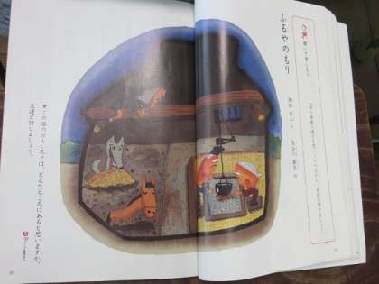 この『ふるやのもり』の題材は、教科書に見開きの大きな挿絵があります。その挿絵を見ながら、子どもたちは、どんなお話か、物語を味わいます。