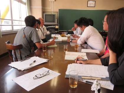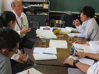 研究授業が終わった後は、会議室や校長室で、研究主事の先生に教えていただきながら、振り返りの研究協議会を行います。今日が2回目の研究授業となる初任者研修では、校長室で授業の録画で場面を確かめながら、細かい点まで、指導をいただいていました。