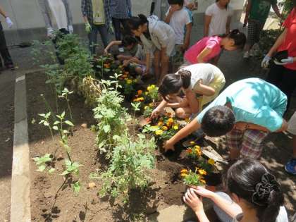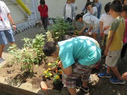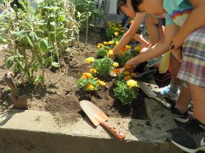 環境委員会の5・6年生の子どもたちは、中休みに、理科室前の花壇の所に集合して、マリーゴールドの苗を植え付けました。