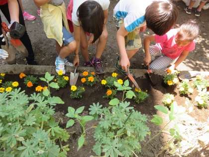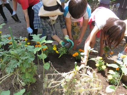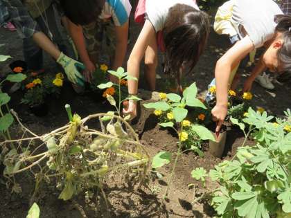 環境委員会の子どもたちが植え付けたマリーゴールドの苗は、八王子市の市制100周年に関連して、全国都市緑化はちおうじフェアに向けて、公益財団法人東京都まちづくり公社より提供していただいた苗です。これらの苗を、フェアのスポット会場となる各小中学校の花壇に植え、「花いっぱい花壇」の取り組みとします。