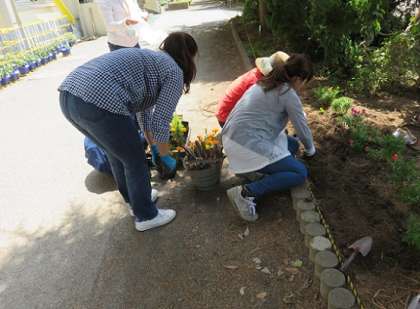 子どもたちの環境委員会と花の会の、理科室前の花壇の苗植えで、植え残ったマリーゴールドの苗を、1年生の教室の前の植え込みの所に植え付けていただきました。