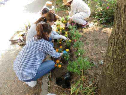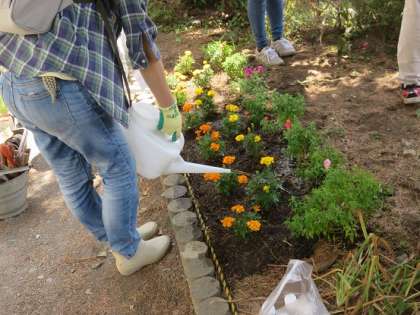 1年生の教室の前の植え込みの所に植え付けられた苗だけでなく、校地内のたくさんのプランターなどのお花の水やりのお世話もいていただいています。
