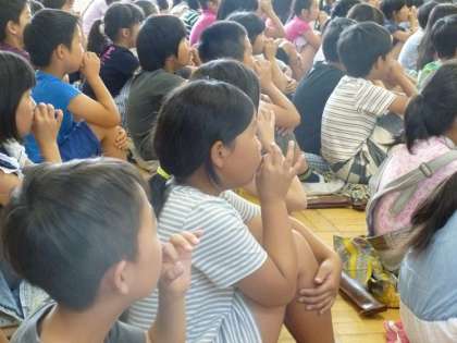 まずは、リコーダーを吹くときに大切なことを教えてもらいました。(1)背筋をぴんと伸ばすこと、(2)持ち方は左手が上、右手が下、(3)わきを空けてリラックス、そして、(4)心を込めて吹くこと。見る見る間に子供たちは背筋を伸ばし、リコーダーを持つ姿勢を作っていきました。短銀具の仕方や息の吹き込み方など、具体的でわかりやすく説明してくださったので、子供たちもよく理解して意欲的に練習に取り組んでいました。