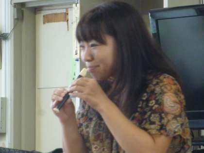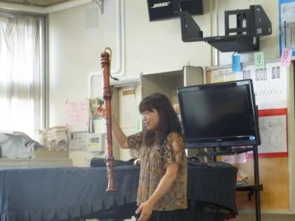後半は、石山先生のミニコンサートです。この日のためにたくさんの種類のリコーダーを持って来てくださいました。本の10cm足らずの身にリコーダーから、1mくらいはある大きなリコーダーまで、子供たちは初めて見るリコーダーに驚いていました。そのリコーダーの音色に合った曲目を演奏してくださり、子供たちは口ずさんだりリズムを取ったりしながら体全体でリコーダーの音色を楽しむ姿がありました。