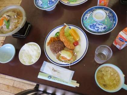 夕食の第一印象は、「和洋折衷」です。ハンバーグや煮物などの和風物と洋風のものがありました。煮物には、栃木で有名な『ゆば』が入っていて、汁がしみ込んでいて、すごくおいしかったです。