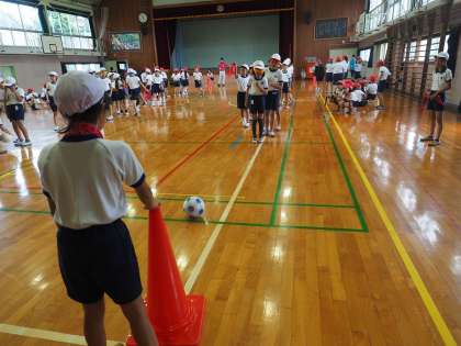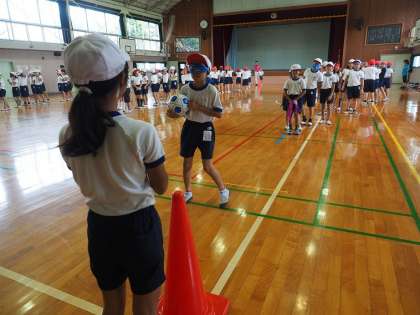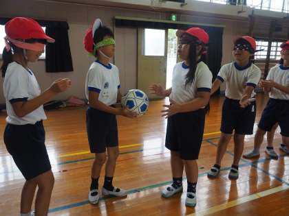 お話のあと、実際にみんなで、ブラインドサッカー用のボールを使って体験しました。まずは、一列に並んでボールを渡していくがゲームです。簡単なゲームのように思えますが、目の見えない状況では、ボールの音と友達の声だけが頼りです。
