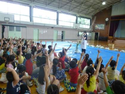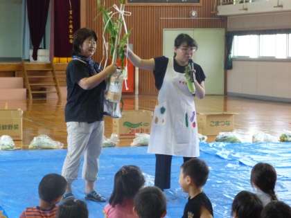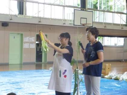 栄養士の鈴木先生が根っこ付きのトウモロコシの苗を持って来てくれました。トウモロコシを届けてくださった農家の方が持って来てくれたそうです。トウモロコシの苗を初めて見た子も多かったようで、興味深そうにながめていました。その後、周りの皮をむいていく実演がありました。何枚の皮にくるまれているのか数えてみると・・・「1枚」「2枚」・・・「11枚!!」ようやく黄色い実が出てくると、歓声があがりました。