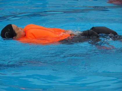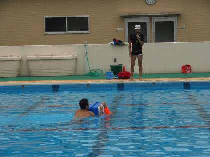 授業の前半では、うっかり水に落ちてしまったときにバタバタせずに、落ち着いてリラックスすることの大切さや、身に付けている衣服を利用して浮かぶ方法を学びました。また、落ちた人を見つけたときには、水に入って助けようとせずに、身近にあるペットボトルやバケツを投げてわたしたり、大声で近くの大人を呼んだりすることの大切さを理解しました。
