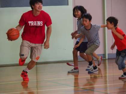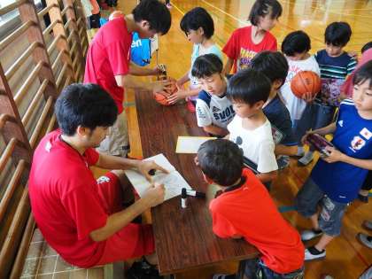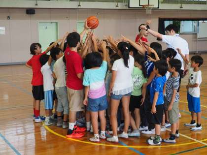 最後は、子供たちチーム対選手のバスケットボール対決です。2人の選手と5〜6人の子供たちぼチームでの対決でしたが、さすがプロ選手です。あっという間にパスを回されシュートされてしまいます。それでも何とかボールを取って、ゴールまでドリブルしたり、必死で選手たちを追いかけて走り回ったりと、子供たちは真剣に勝負に挑んでいました。一生懸命試合に臨む子供たちの顔には汗と笑顔が光っていました。
