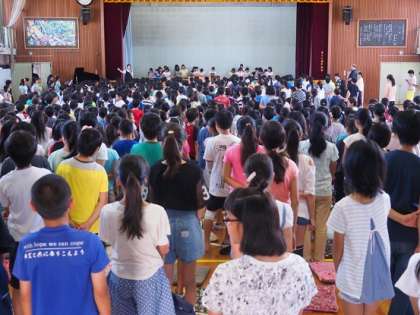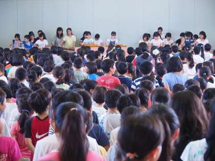 各学級が、“学級の願いごと”の発表のあとは、音楽クラブの子どもたちの箏や大正箏で演奏に合わせて、『たなばたさま』の歌を全員で合唱しました。