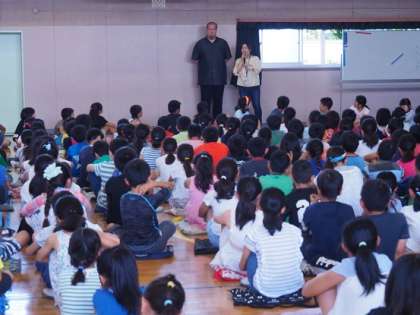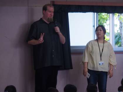 この『七夕』集会には、昨年に引き続き、八王子市内にある都立桑志高等学校の英語の先生(JET青年)が一緒に参加していただいています。子どもたちも、去年教えてもらった名前を憶えていて、