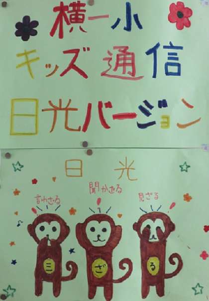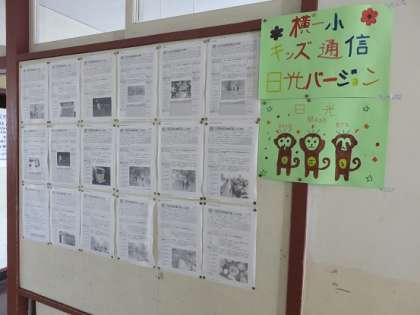 6年生の“日光移動教室子どもレポーター”の子どもたちがコメントを書き、本校のホームページに掲載した記事を、北校舎の6年生の教室の間にある、算数科の習熟度別kコース指導で使う教室の前の廊下に掲示しています。