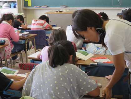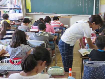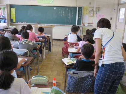 子どもたちは、“夏”からイメージする言葉をもとに、各々に、五七五の音に合わせて、自分らしさの滲み出るすてきな表現を考えていました。先生が机の間をこまめに回って、子どもたちの考えが上手に形になるように相談にのってくれていました。