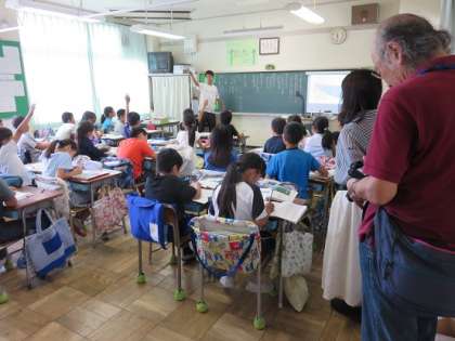 同じ4時間目に、4年生の隣の教室でも、『夏の風景 〜夏の風景を表した五七五を作ろう〜』の国語の学習をしていました。五七五がイメージしやすいように、先生が自作の表現を紹介していました。そして、