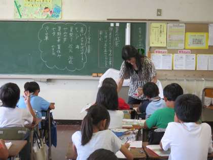 子どもたちは、みんなで出し合った“夏をイメージする言葉”を手がかりに、五七五の形を意識しながら、表現を考え出していました。