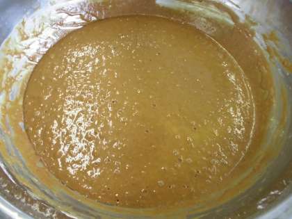 鹿児島ふくれ菓子は、小麦粉、黒砂糖、重曹だけで作る、素朴なお菓子です。重曹でふっくらと蒸し上がるので、「ソーダ菓子」ともいいます。「ソーダ菓子」の生地の写真です。