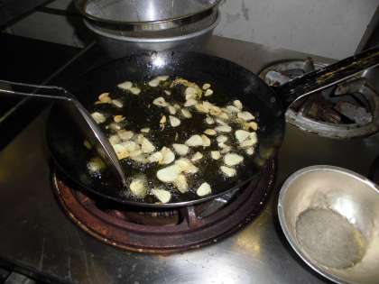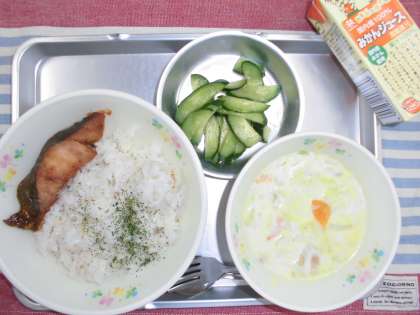 今日のごはんは、ガーリックライスです。薄くスライスしたニンニクを、オリーブオイルでカリッと揚げました。配缶する際、揚げたニンニクと、オイルをご飯に混ぜることで、ニンニクの風味をごはん全体につけることができました。