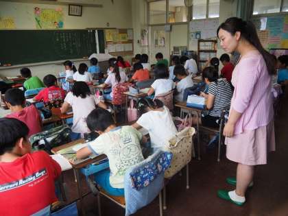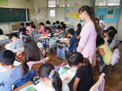 4校時は、4年生の3つの学級が、国語の授業で、『夏の風景 “夏”の言葉からイメージして表現しよう』の同じ題材で授業を行い、授業や子どもたちの反応の仕方の違いなどを比べながら見ていただきました。