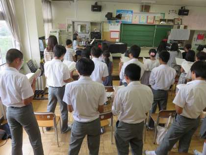 合唱を中学生とやりました。声出しでは『時の旅人』を歌っていました。男性パートと女性パートの“はもり”がきれいでした。私たち6年生は、中学生と一緒に、『夢の世界』を歌いました。