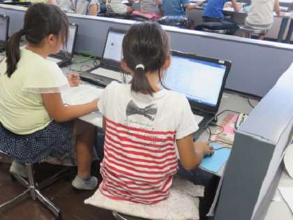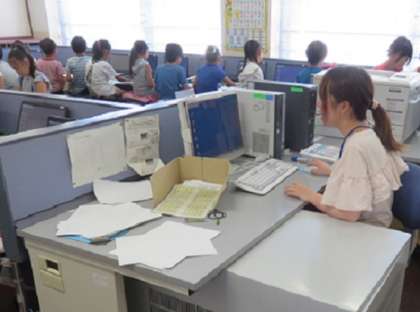 3年生の子どもたちは、パソコン室で、一人ひとりパソコンに向かって操作の仕方を勉強していました。センター機を扱う先生の操作で、場面が切り替わったりして、どのように操作をしたら、上手にパソコンが扱えるかを覚えていました。