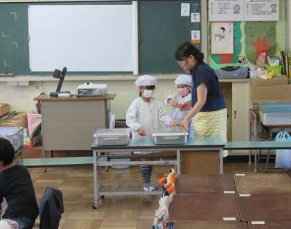 小学校に入ってから初めて経験した“小学校での給食当番”も、一学期も最終日になると、ずいぶん上手になりました。配膳車から教室の配膳台にセッティングするのも、先生に、少し声かけしてもらえるだけで自分たちでできるようになってきています。