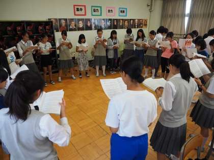 私は、音楽の授業をならいました。男女ともに声がすごく出ていて、きれいにハモっていて、素敵な歌声が聞けました。私たちも、同じ歌を歌いましたが、すごくハードルが高くて、