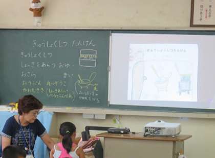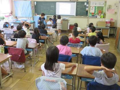 子どもたちは、教えてもらったことをもとに、カードにまとめ、一人ひとり発表をしました。発表のとき、先生に書画カメラで、カードがみんなに見えるように映し出してもらっていました。