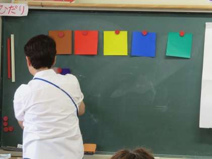 What’s color is this? の発問に応えて、子ども役の教員が、声を揃えて答えます。また、