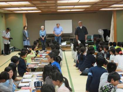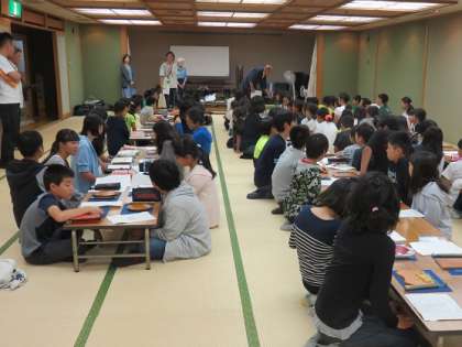ハイキングを終えて、荷物片付けをし、一息ついた子どもたちは、『日光彫り』の下絵を持って、地下一階の大広間に集合しました。